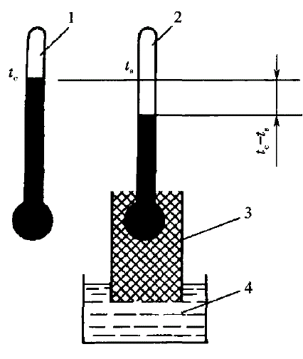 1-干球温度计,2-湿球温度计,3-纱布(湿润),4-水杯