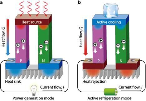 (a)热电发电:在热电器件的两端施加温差,冷端会产生从P型电偶传到N型电偶的电动势,整个回路中会产生电流,实现温差发电